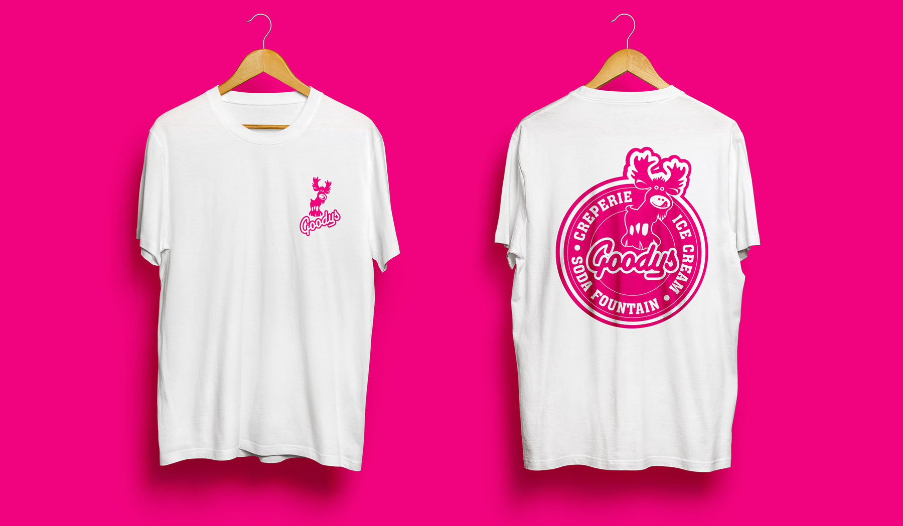 Goodys is a family owned business in Winter Park, Colorado. They serve authentic french crepés, all natural ice cream and Italian sodas. The Goodys logo incorporated a handcrafted logotype and the Goodys moose. Notice the moose’s nose and mouth is actually a smiley face.